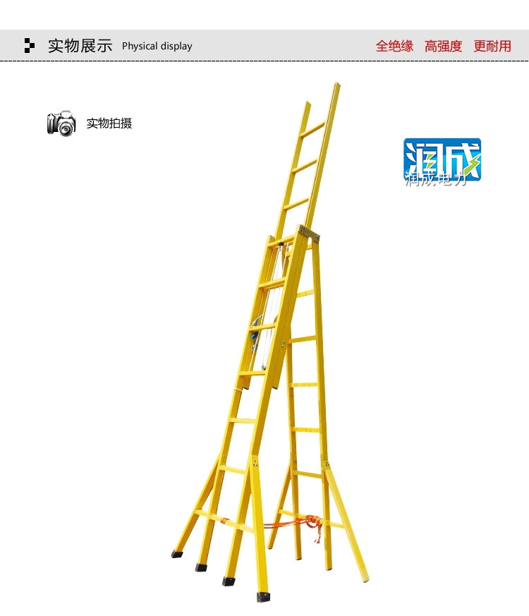 2、耐超高压玻璃纤维绝缘梯,玻璃纤维踩杆,特殊工艺制作,耐压在220AKV以下带电操作。注意事项:严格遵守安全操作规程,杜绝侥幸心理使用时,严格按照GB17620-1998标准执行使用前操作人员应认真检查绝缘梯主体及零部件,有无缺陷或裂纹。边接是否牢固,各种配件是否松脱等,严防意外发生。防止受潮、损伤,以免影响绝缘等级。为保证产品性能的安全可靠,须以年度为周期对性能进行检测。